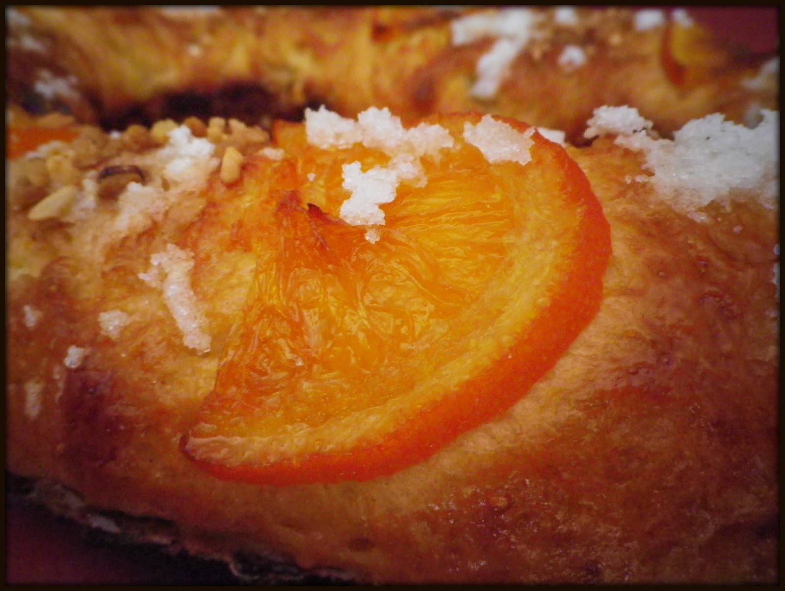 Otra cosa que tenía clara es que mi roscón no llevaría frutas escarchadas, no tengo nada contra ellas pero no me gustan nada y, para terminar apartándolas, preferí no ponerlas. Las sustituí por naranja confitada también casera y que preparé en una de las "siestas" del roscón.